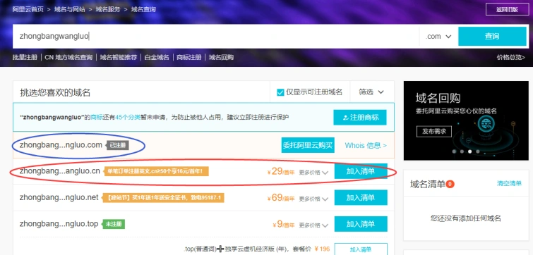 2. 输入你想要的域名,点击查询。已注册域名无法购买,加入清单域名可购买。