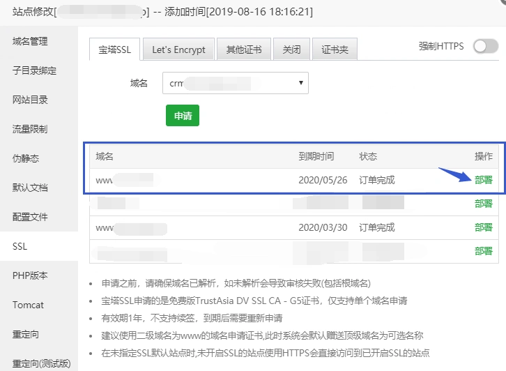 (1)此证书为宝塔免费证书,有效期一年。