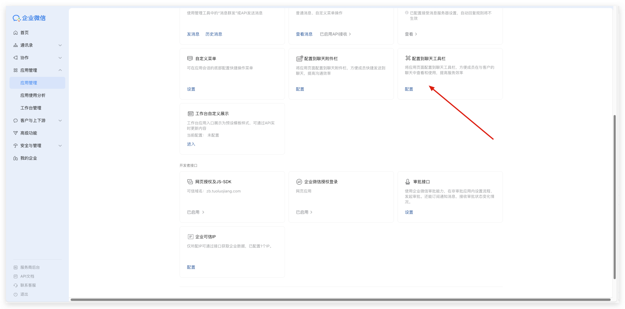 1)在应用详情页面,点击【配置到聊天工具栏】