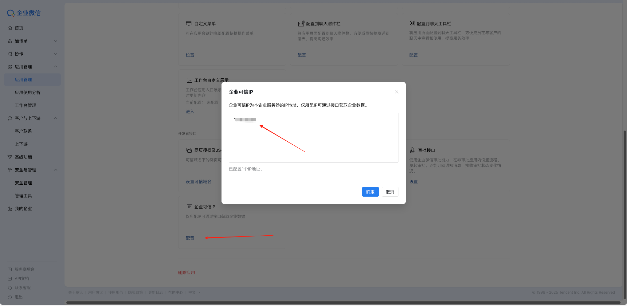 1)在应用详情页面,一直放下拉,点击【企业可信IP】