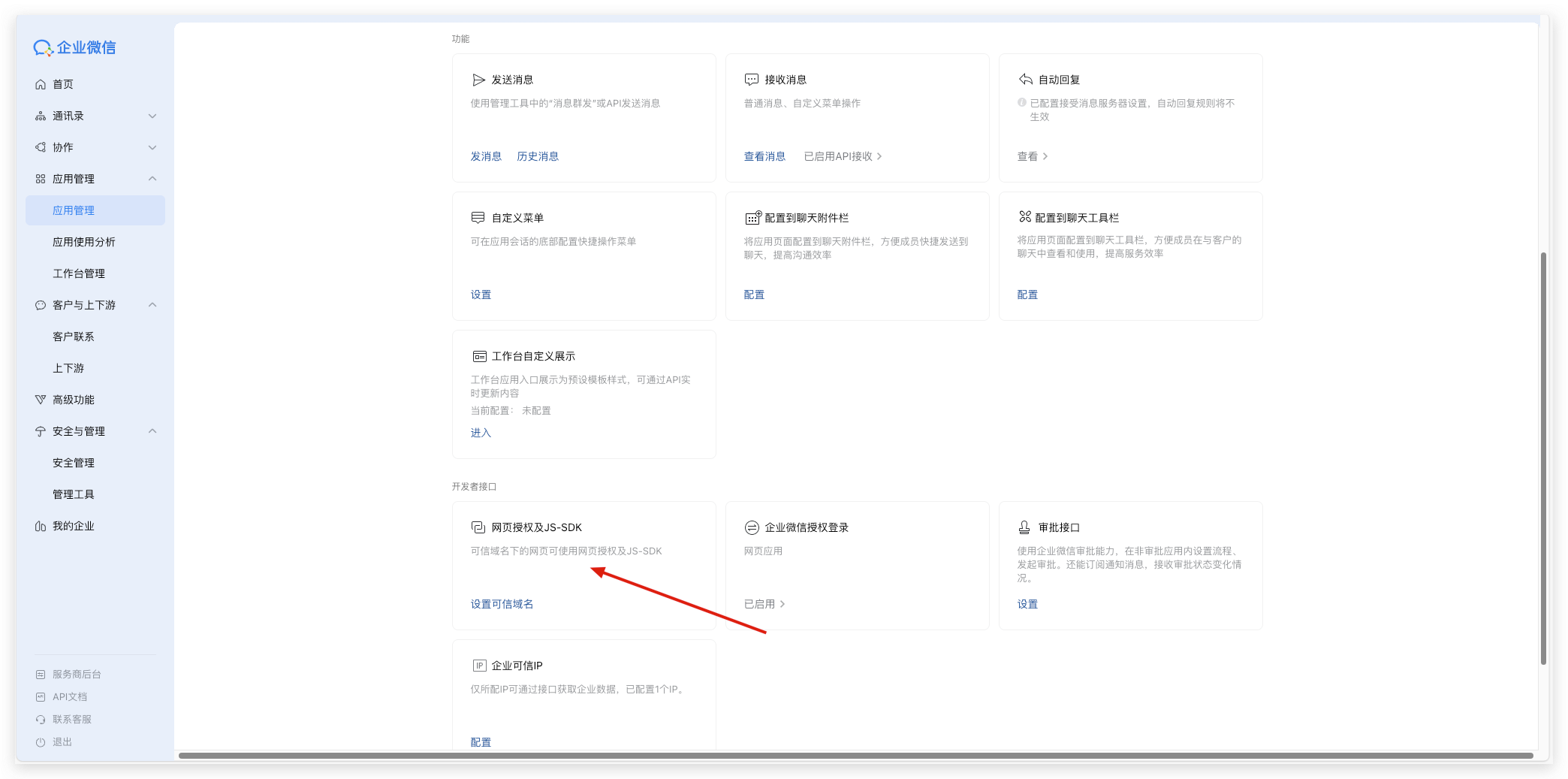 1)在应用详情页面,一直放下拉,点击【网页授权及JS-SDK】