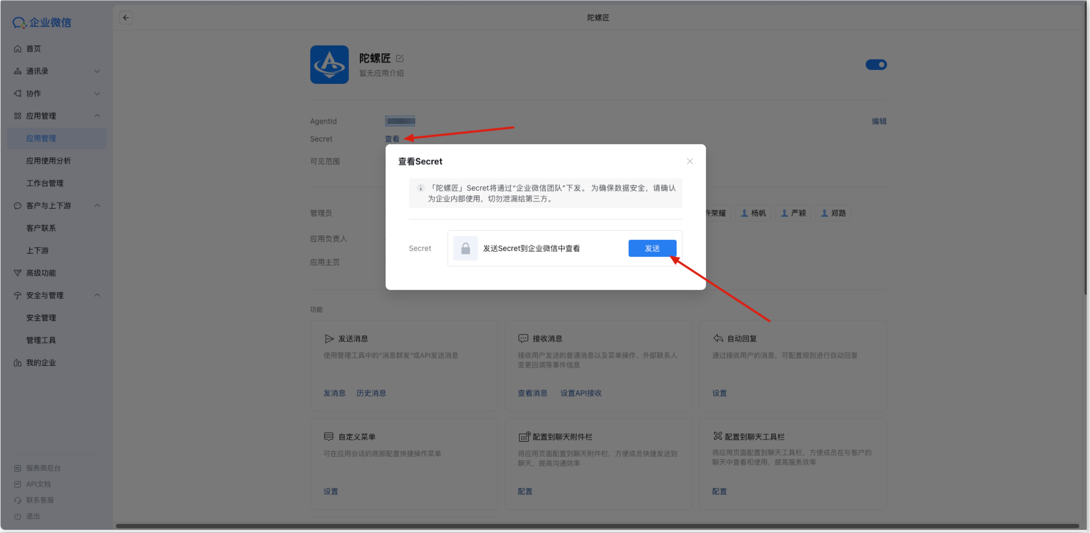 1)点击【查看】按钮,在查看Secret弹窗中点击【发送】