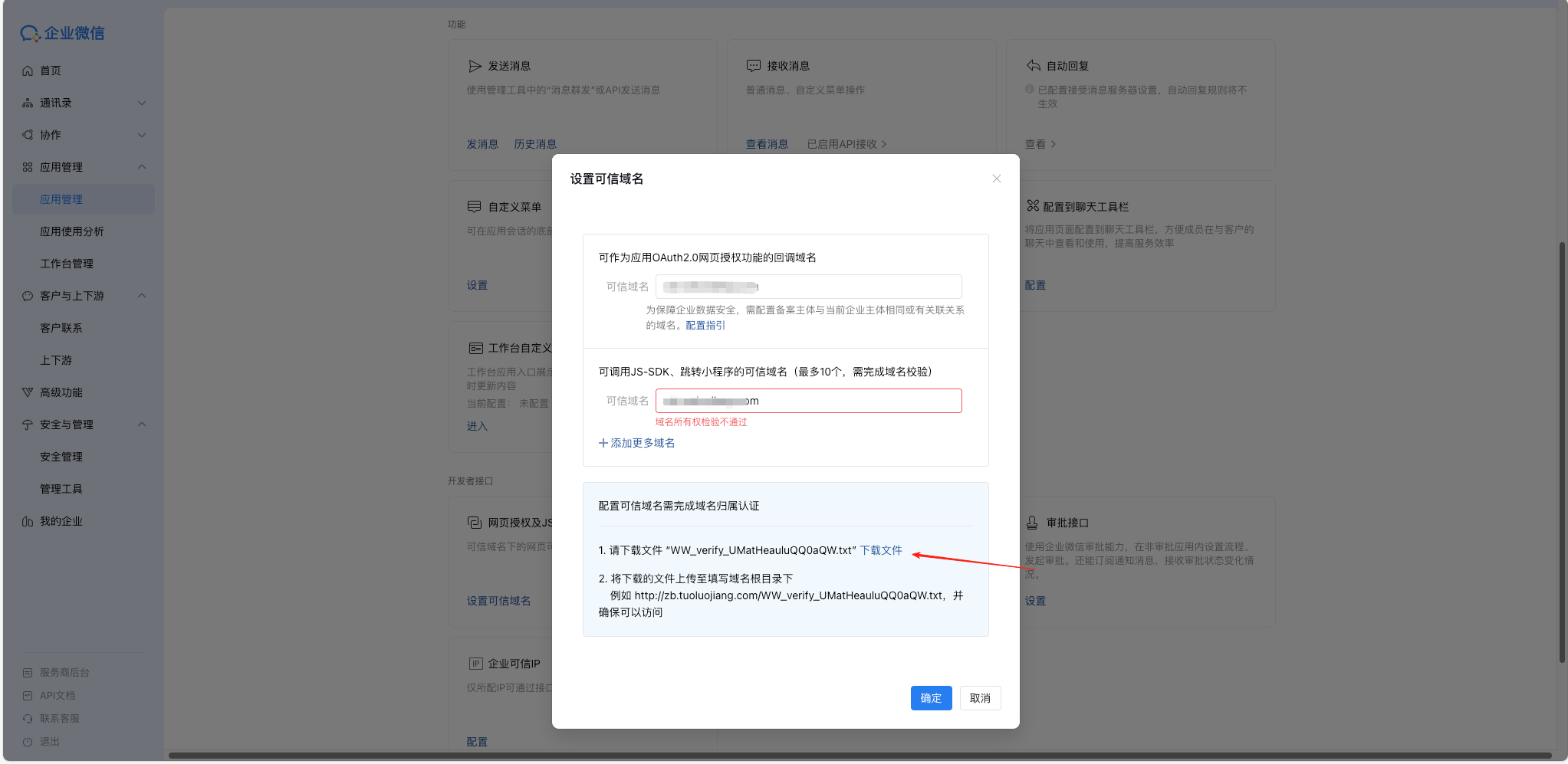 若出现域名所有权检验不通过提示,则下载对应文件,放在项目public目录下,然后重新进行设置保存