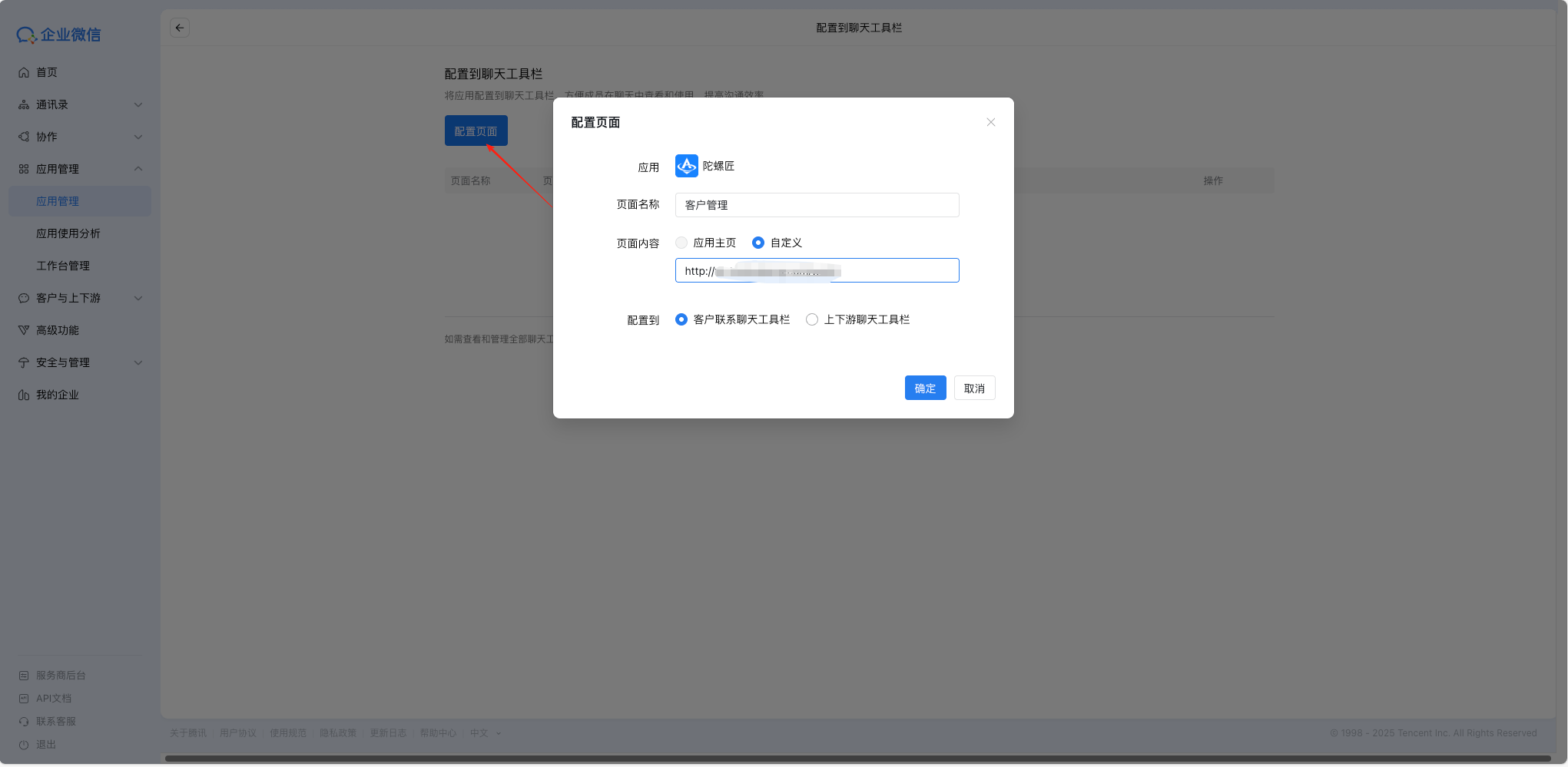 2)点击【配置页面】按钮,填写移动端H5的页面链接,例如:https://abc.com/work ,【确定】后完成