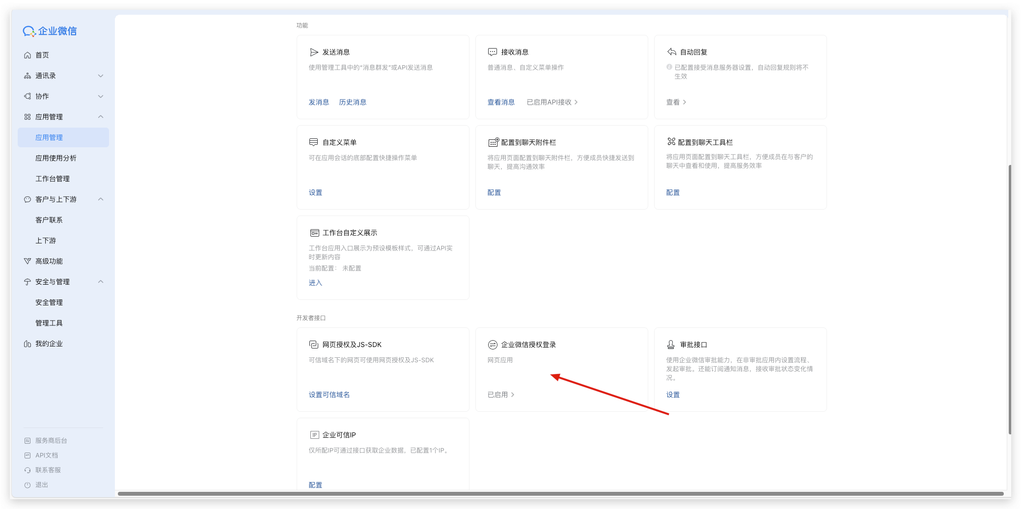1)在应用详情页面,一直放下拉,点击【企业微信授权登录】
