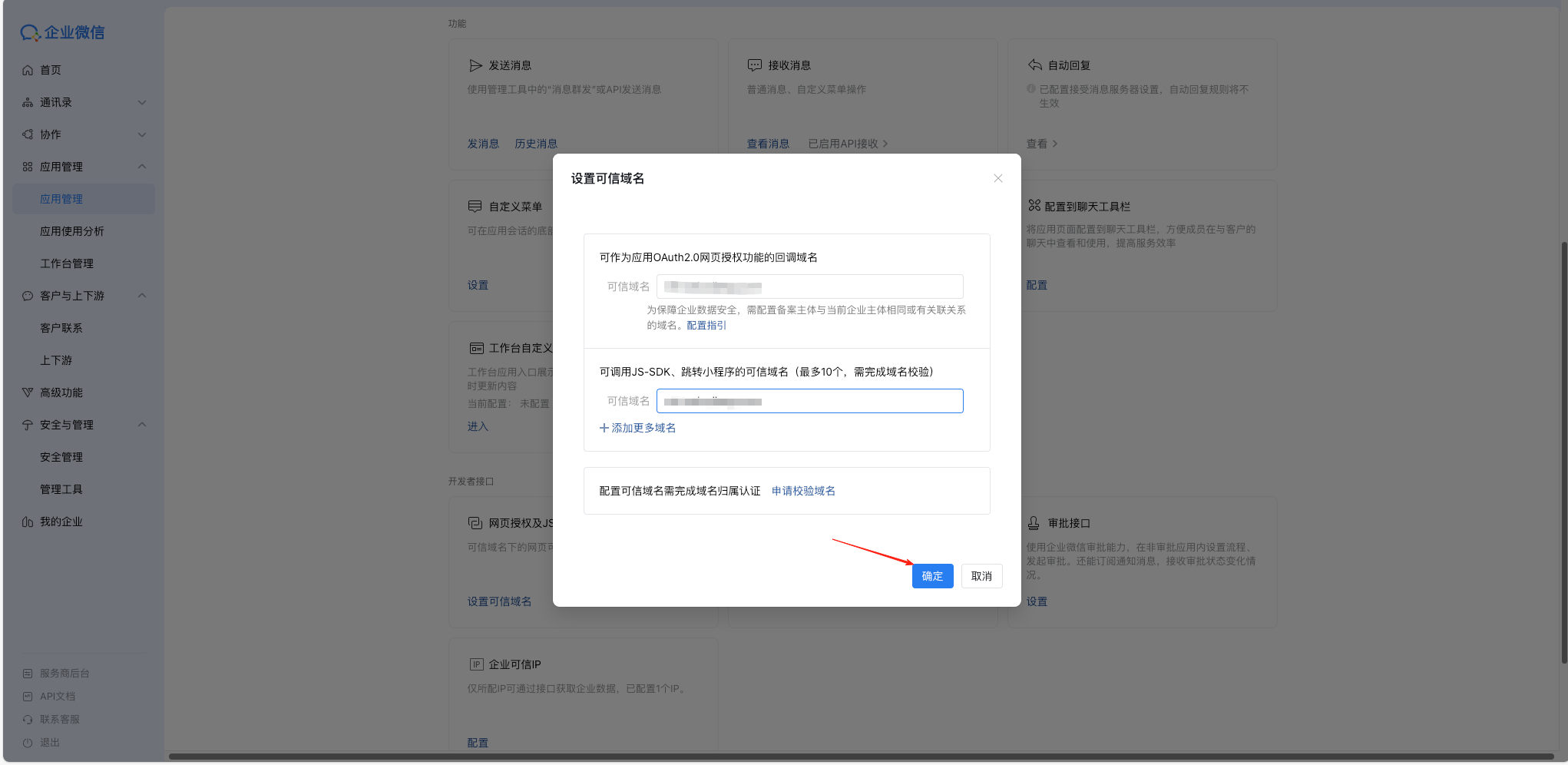 2)在设置可信域名弹窗中,填写对应域名,例如:abc.com「不需要http及其相关后缀」,【确定】后完成