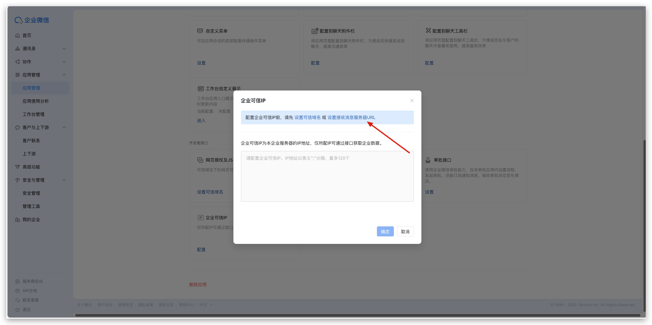 2)在企业可信IP弹窗中,点击【设置接收消息服务器URL】