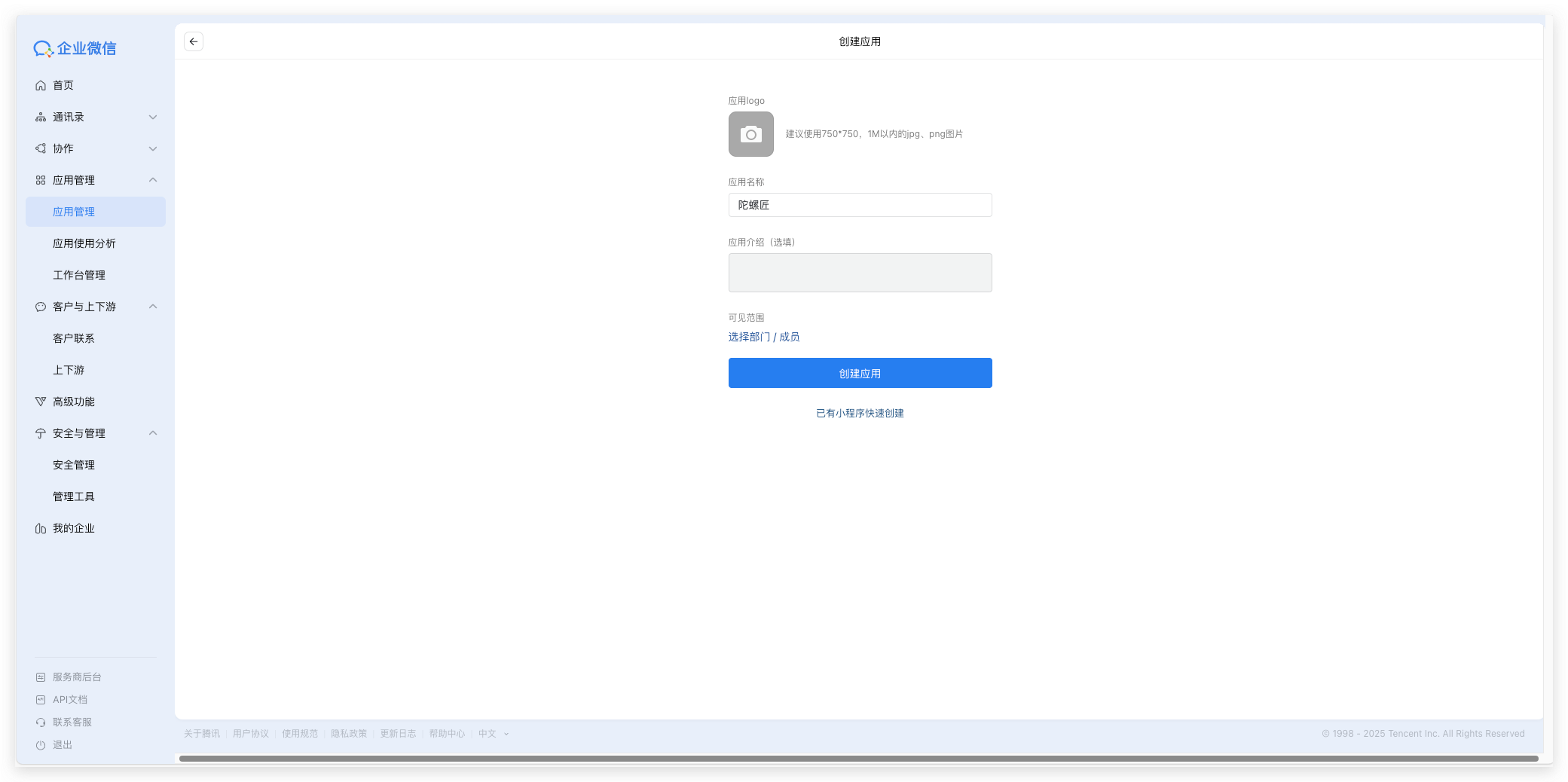 3)在添加应用页面中,填写对应的应用logo、名称,及可以使用的员工