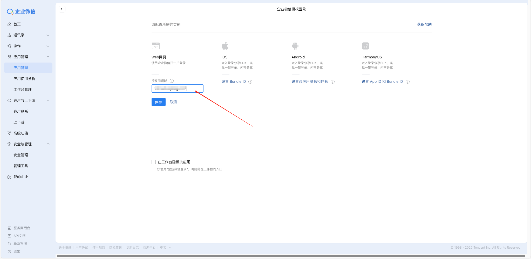 2)在企业微信授权登录页面,填写授权回调域名,例如:abc.com「不需要http及其相关后缀」,【保存】后完成